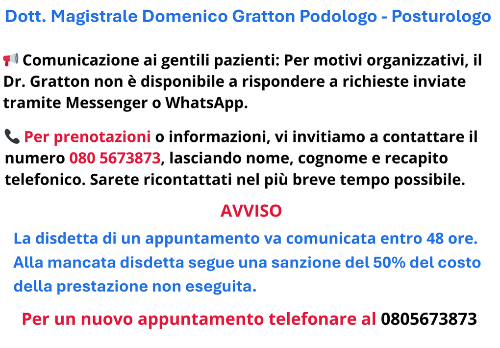 Il dott. Gratton laurea magistrale , podologo e posturologo, iscritto all’Ordine Interprovinciale Tsrm & Pstrp Albo dei Podologi di Bari Taranto Bat n° 6 e componente della commissione d'Albo dei Podologi dell'Ordine Bari Taranto e Bat.
